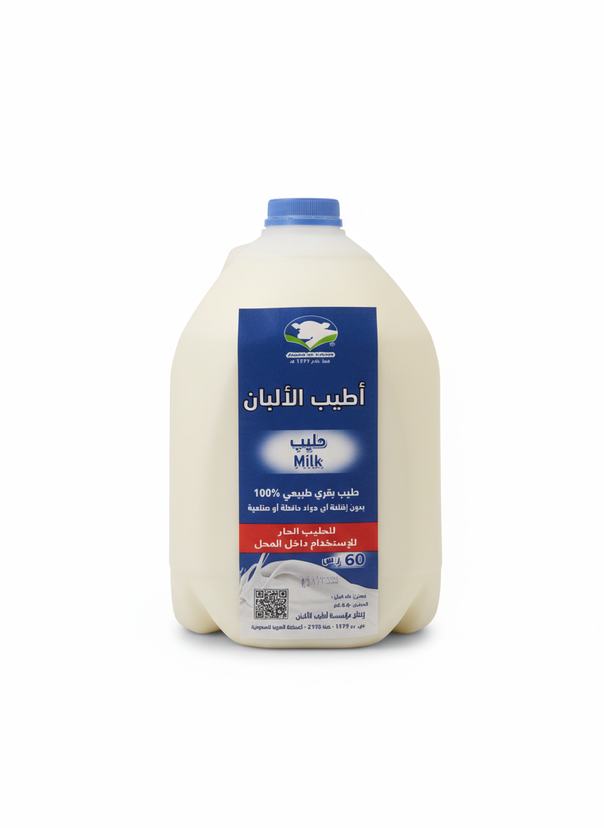 المكوّن, لكل حصة (200 مل), لكل 100 مل, لكل 6 حصص (1.2 لتر), ——————————–, —————-, ———-, ——————-, **السعرات الحرارية**, 130 kcal, 65 kcal, 780 kcal, **إجمالي الدهون**, 7.4 g, 3.7 g, 44.4 g, الدهون المشبعة, 4.6 g, 2.3 g, 27.6 g, الدهون الأحادية غير المشبعة, 2 g, 1 g, 12 g, الدهون المتعددة غير المشبعة, 0.3 g, 0.15 g, 1.8 g, **الكوليسترول**, 25 mg, 12.5 mg, 150 mg, **الصوديوم**, 95 mg, 47.5 mg, 570 mg, **إجمالي الكربوهيدرات**, 9.6 g, 4.8 g, 57.6 g, الألياف الغذائية, 0 g, 0 g, 0 g, إجمالي السكريات (لاكتوز طبيعي)**, 9.6 g, 4.8 g, 57.6 g, **البروتين**, 6.6 g, 3.3 g, 39.6 g