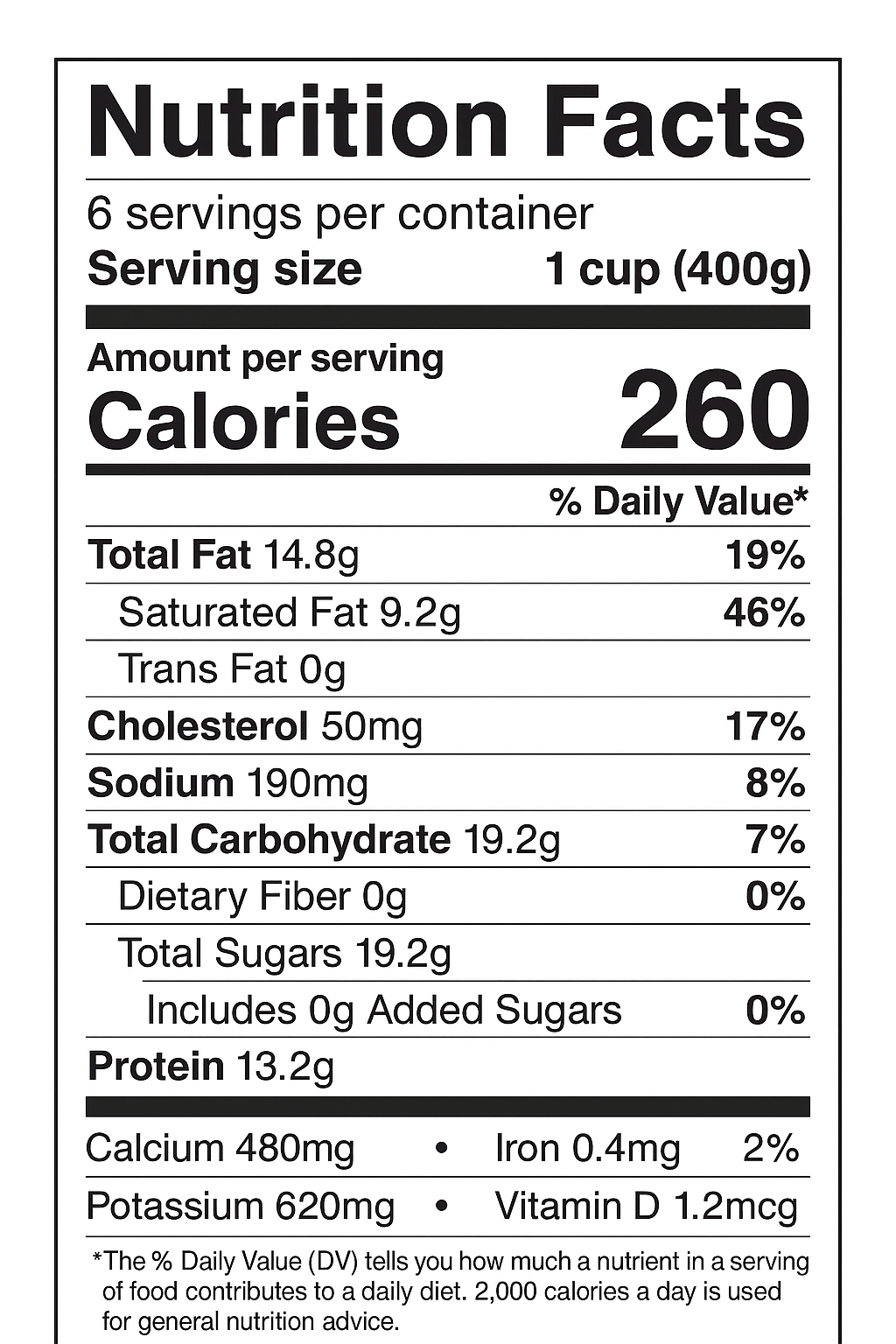 العنصر الغذائي, الكمية في 400 غرام, ———————————-, ——————, **السعرات الحرارية**, **260 kcal**, **إجمالي الدهون**, **14.8 g**, الدهون المشبعة, 9.2 g, الدهون الأحادية غير المشبعة, 4.0 g, الدهون المتعددة غير المشبعة, 0.6 g, **الكوليسترول**, 50 mg, **الصوديوم**, 190 mg, **إجمالي الكربوهيدرات**, 19.2 g, الألياف الغذائية, 0 g, إجمالي السكريات (لاكتوز طبيعي)**, 19.2 g, **السكريات المضافة**, 0 g, **البروتين**, **13.2 g**